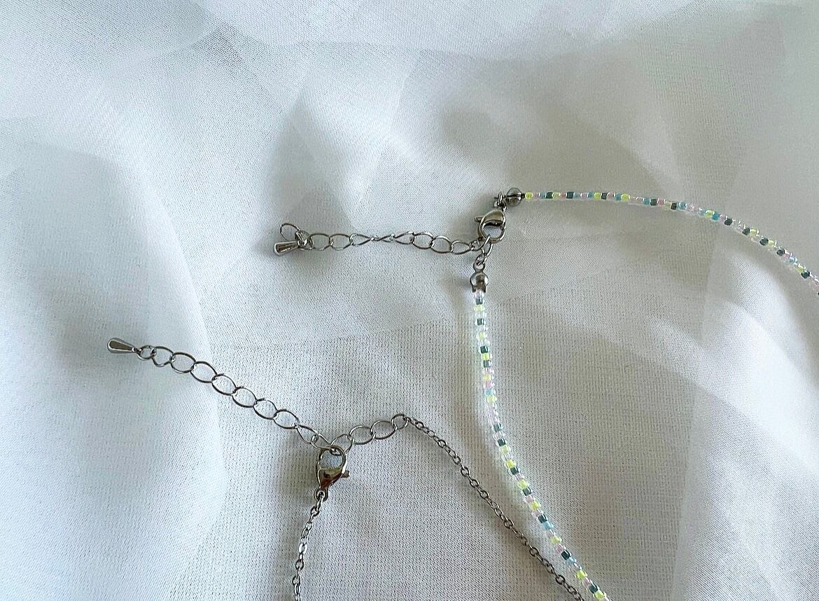 シルバーチェーンとカラフルなクリアビーズの組み合わせがとてもシンプルで綺麗です。透明感のあるビーズが首元を綺麗に見せてくれます。クリアビーズは優しい色なのでシンプルで使いやすいと思います。