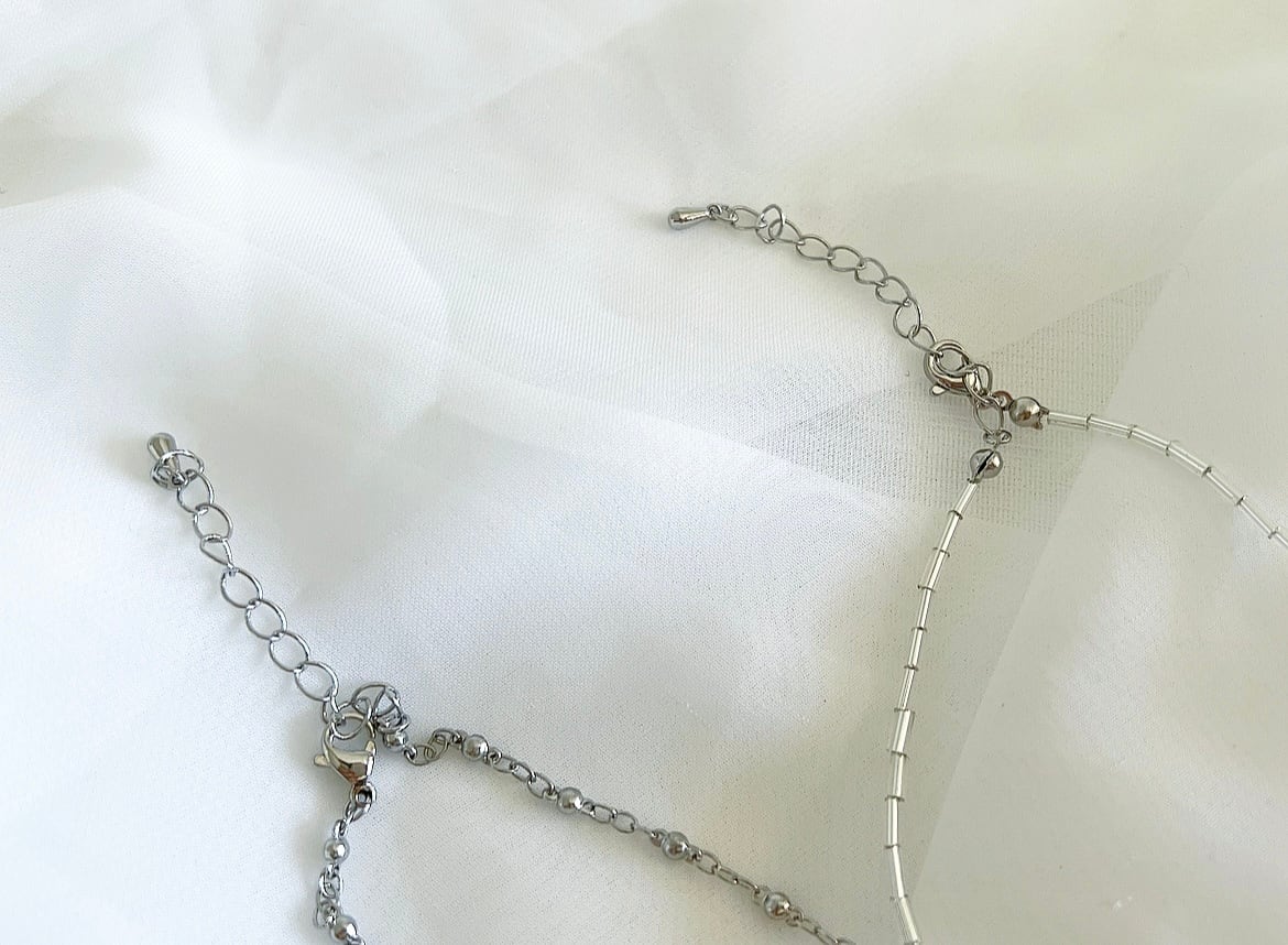 シルバーチェーンとシルバーカラーの竹ビーズの組み合わせがとてもシンプルで綺麗です。透明感のあるビーズが首元を綺麗に見せてくれます。ビーズは優しい色なのでシンプルで使いやすいと思います。