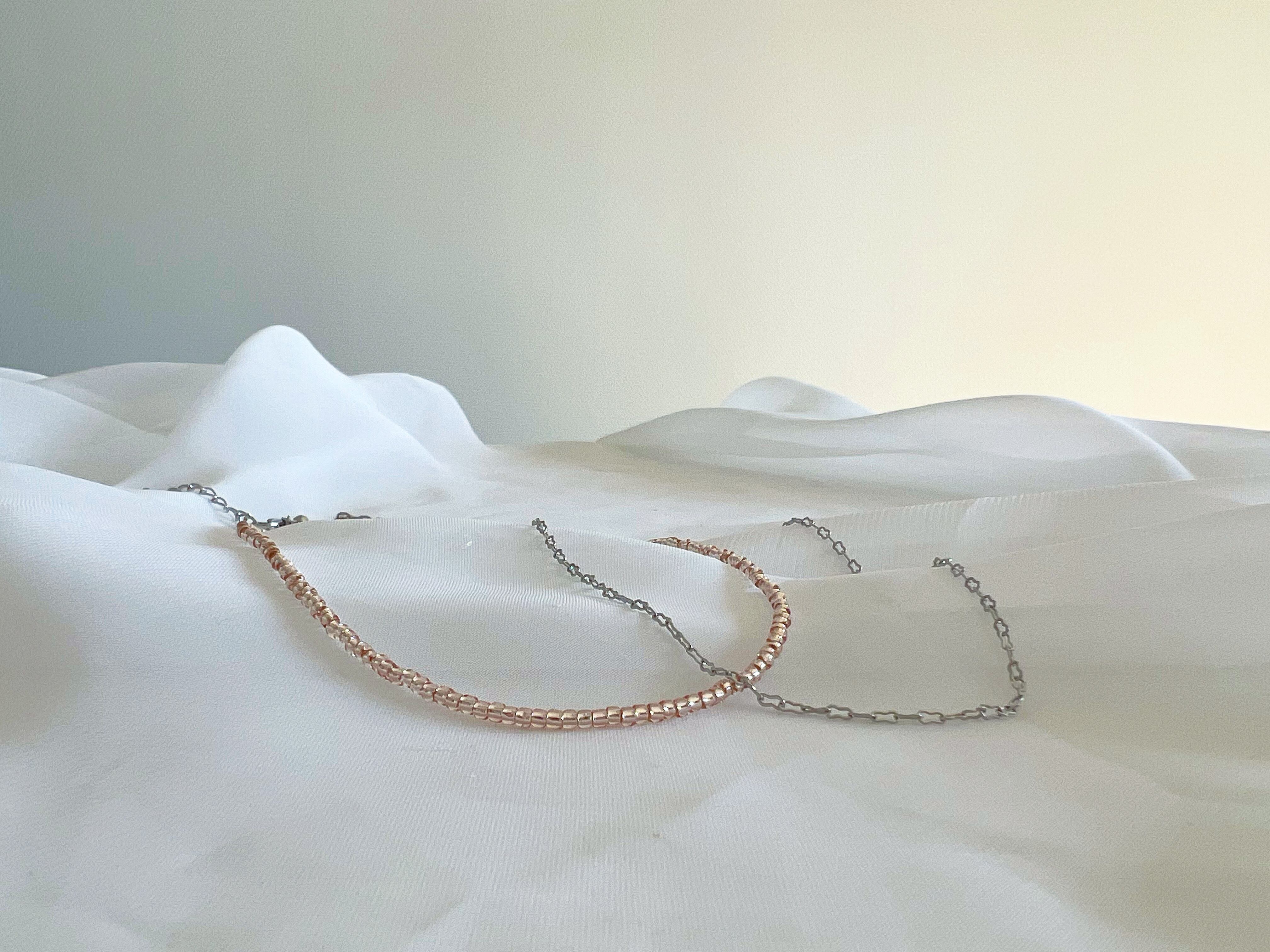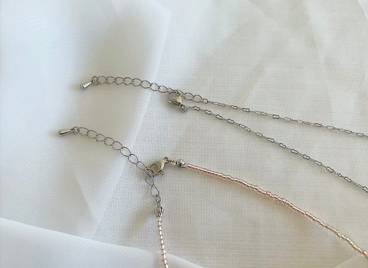 シルバーチェーンと淡いピンクビーズの組み合わせがとてもシンプルで綺麗です。肌馴染みの良いピンクビーズが首元を綺麗に見せてくれます。シンプルで使いやすいと思います。